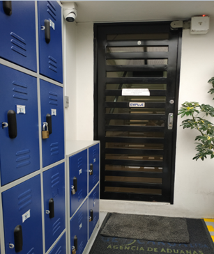 ● Debe anunciarse a través del citófono y una vez se dé autorización de ingreso, deberá mostrar su maleta, maletín, bolso y demás paquetes que ingrese por medio de la cámara que se encuentra ubicada en la segunda entrada y el proceso se repetirá a la salida. En caso de que la recepcionista considere necesario le asignará un locker para dejar paquetes de gran volumen.